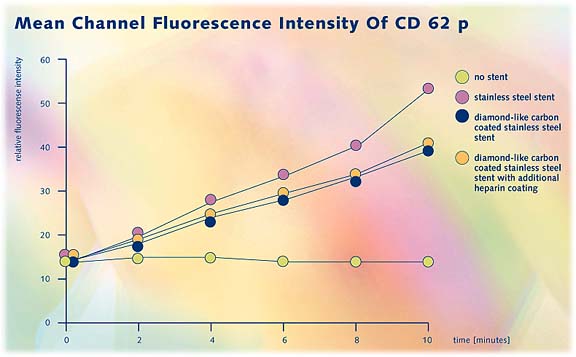 The thrombocyte activity marker CD 62p is reduced in diamond-like coated stents and diamond-like coated stents with heparin compared with uncoated stents.