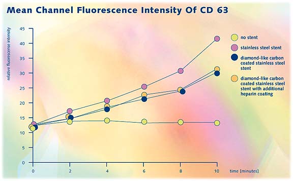 The strongest thrombocyte activation occurred with the uncoated stainless steel stents. The diamond-like stainless steel stents or the diamond-like steel stents coated with heparin proved to be a significant lower activation of thrombocytes.