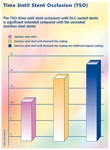 The experiments also demonstrated that there is a remarkable reduction of thrombogenic potential by the DLC-stents which is reduced further for the DLC-stents with a heparin coating. The TSO (time until stent occlusion) with coated stents is significantly extended compared with the uncoated stainless steel stents.