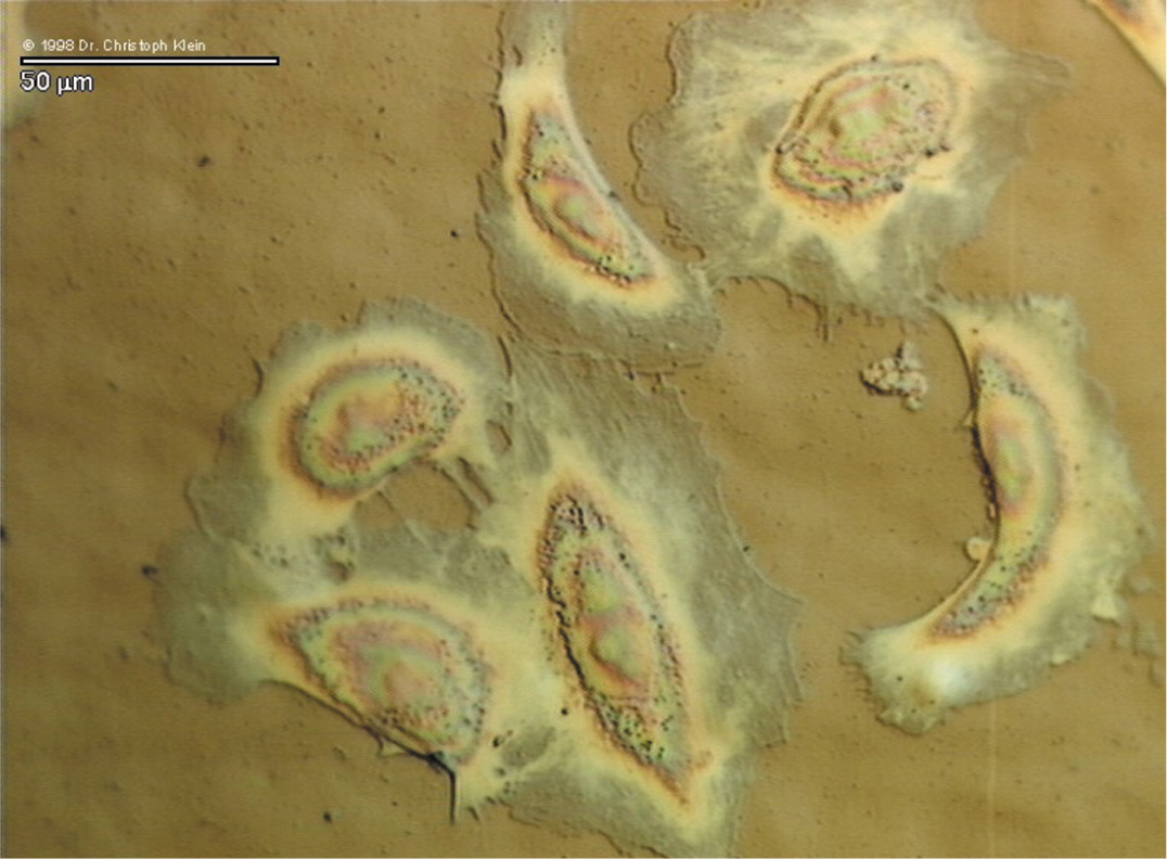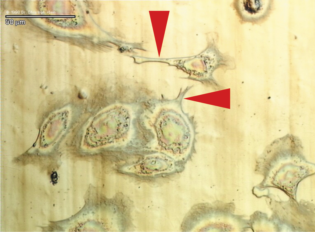 Notice that on stainless steel pseudopodia (red arrows) are formed and that the cytoplasmic offshoots are much thinner than on diamond. Shearing experiments reveal a significantly stronger adhesion of cells on diamond in comparison to metal. |