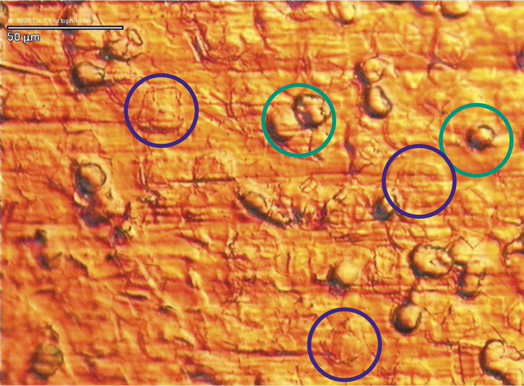 The metal surface is covered with flattened activated granulocytes (exemplary in blue circles) in comparison to the Diamond-Like surface with inactivated round granulocytes (exemplary in green circles). Data and photographs from Dr. C. Klein, University of Mainz. |