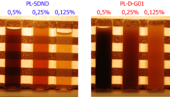 Figure caption: Colloidal solutions of single-digit NanoDiamonds (SDND) (left) in comparison with the solutions of standard nanodiamonds (right) at concentrations of 0.5, 0.25 and 0.125 mg/mL.
